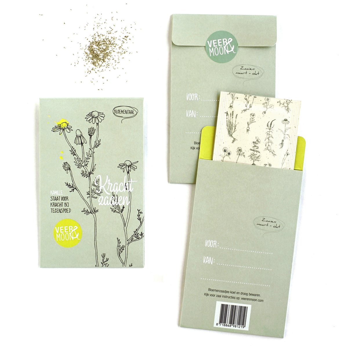 Het zadenzakje met bloemenzaden ‘Kracht zaaien’ bevat kamille zaden. Kamille staat voor kracht bij tegenspoed. Er is de mogelijkheid om achterop de verpakking de naam van de zender en ontvanger te zetten. Erg leuk om te versturen, bijvoorbeeld samen met een mooie kaart.