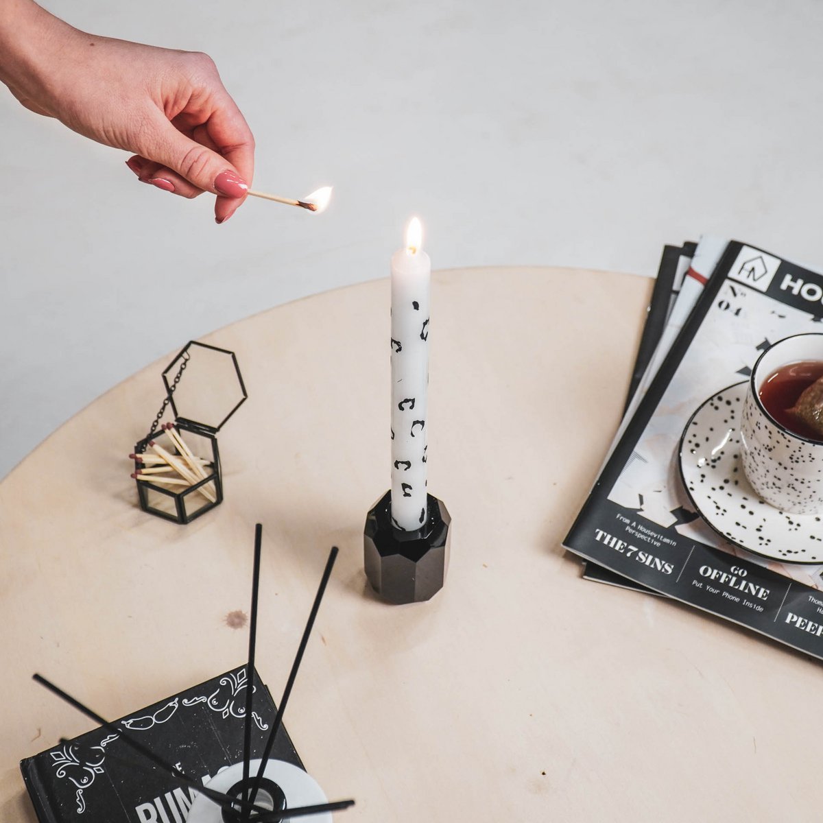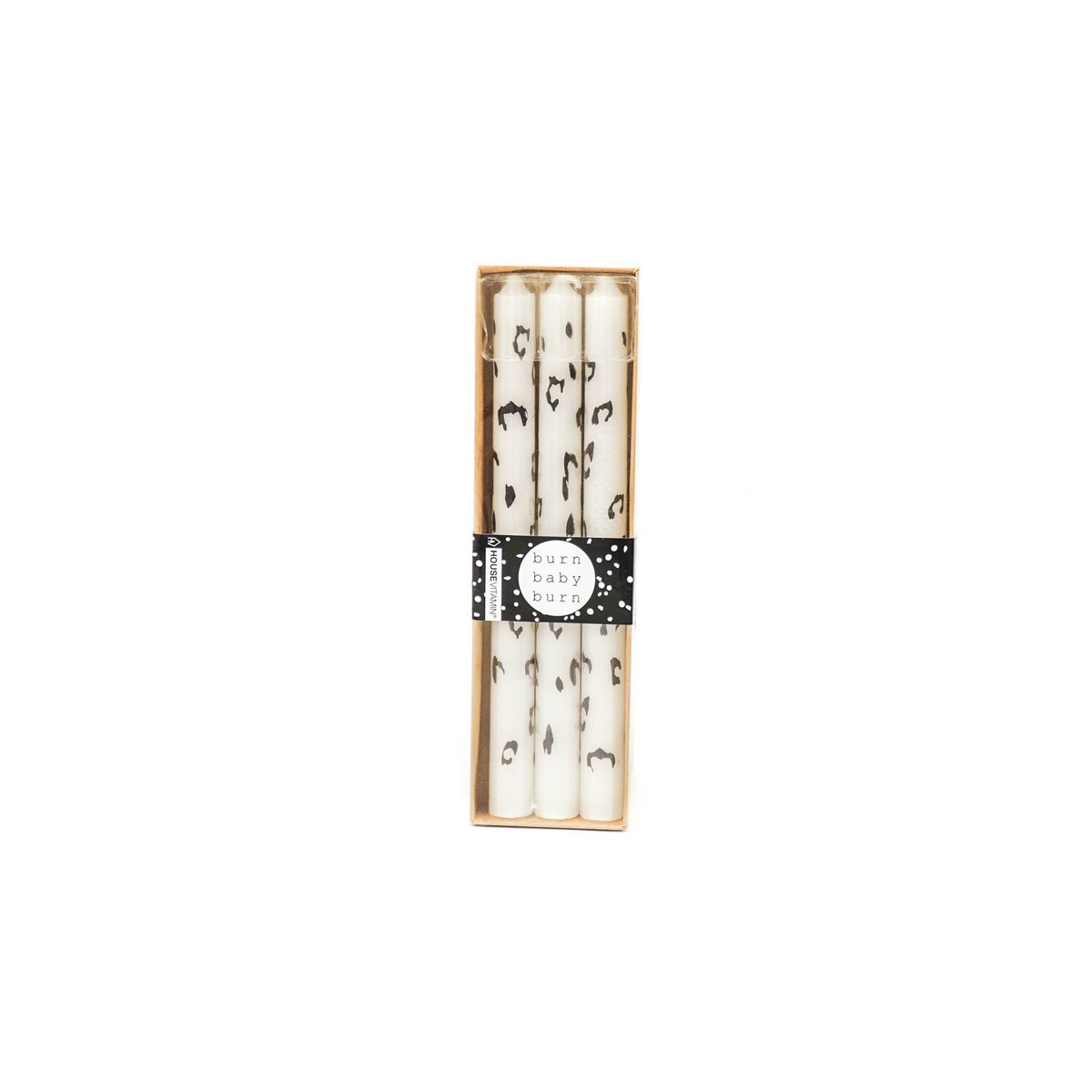 Trendy witte kaarsen met zwarte panterprint met ieder een afmeting van 2 x 25 cm. Kaarsen zijn de perfecte lichtmakers en een belangrijk ingrediënt voor gezelligheid en romantiek. Daarnaast staan deze kaarsen ook overdag heel trendy in je interieur.