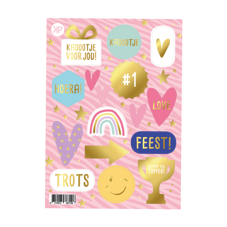 Super vrolijk A5 stickervel met verschillende kleurrijke stickers. Dit luxe stickervel is voorzien van goudfolie. Deze stickers zijn leuk om te gebruiken op cadeaus en cadeaupapier. Leuke variatie aan stickers op 1 vel, met diverse vormen zoals een regenboog, smiley, prijsbeker of hartjes.