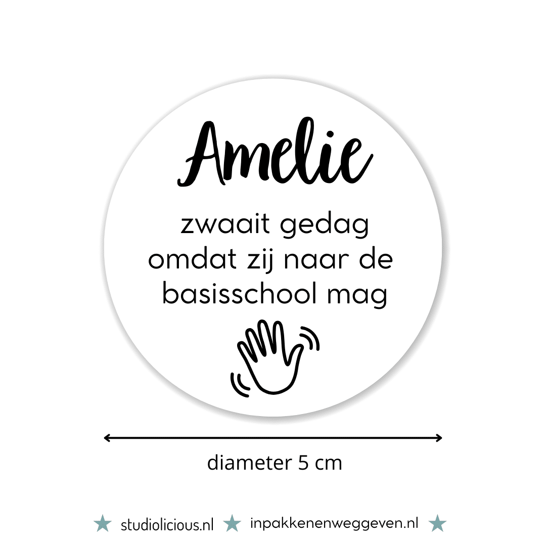 Gaat jouw dochter binnenkort naar de basisschool? Deze naamsticker met “*Naam* zwaait gedag omdat zij naar de basisschool mag” is super leuk om verjaardag traktaties te personaliseren en te trakteren op de kinderopvang. Je kunt deze stickers apart bestellen, of in combinatie met kant en klare kindertraktaties.