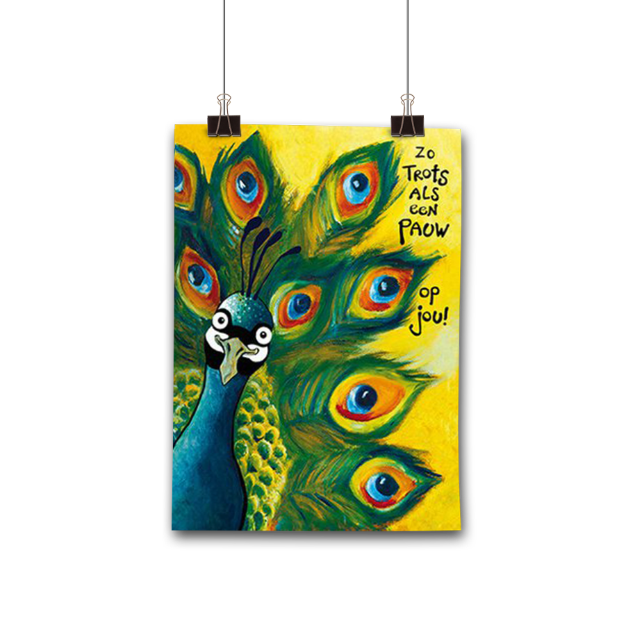 Wie houdt er nu niet van leuke post? De postkaart “Zo trots als een pauw op jou!” is perfect geschikt om iemand te laten weten dat je trots op ze bent. Deze kleurrijke postkaart op A6 formaat is gedrukt op 350 grams karton met een glanzende voorkant en beschrijfbare achterkant.
